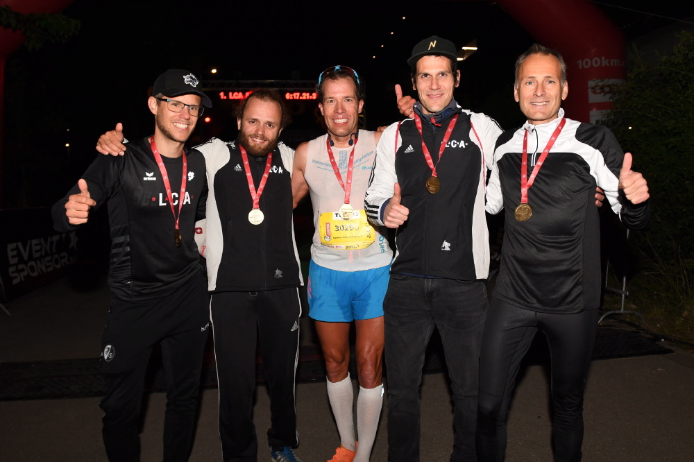 Auch das Team Christian Meyer, Erhard Bürgi, Niklaus Mäder, Kaspar Gerber und Hans Buser nahm gemeinsam die 100km in Angriff. Gemeinsam liefen wir durch die sommerliche Nacht und genossen den Anlass. Tinu begleitete uns mit seinem Auto, vielen Dank. Vielen Dank auch an Hans welcher kurzfristiig den letzten Streckenabschnitt übernahm.