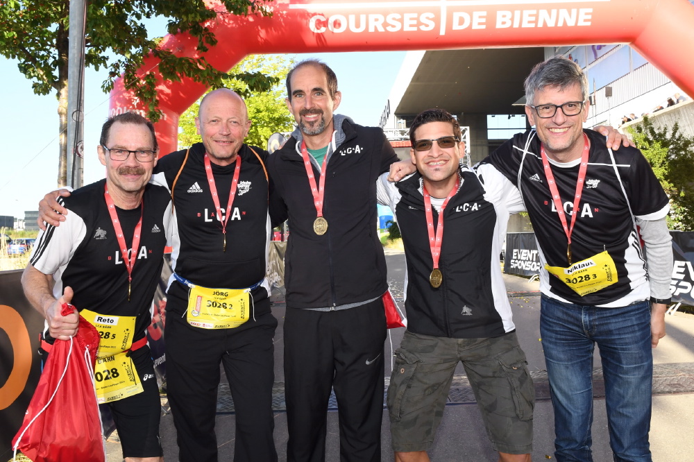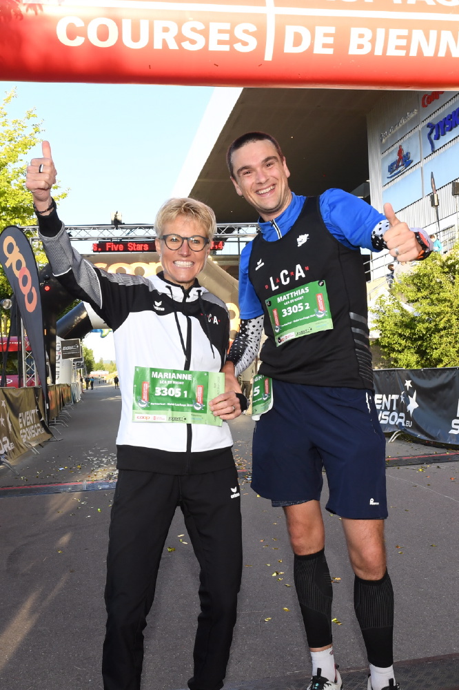 Kurzer Abklatsch, mit den «machs gut» und «Heya» Rufen in den Ohren, verschwand ich mit voll Schuss in der Dunkelheit. Doch von Anfang an: Auch für mich ungewohnt geht es abends, zwar noch im Tenue légère, jedoch ungewohnt spät nach Biel. Die Stimmung, die Gespräche etc. halten mich fit und motiviert (und natürlich auch wach). Nach den besagten Starts um 22:30 Uhr und dem Start des Habmarathons um 22:45 Uhr versuchte ich noch ein wenig auszuruhen und zu schlafen, diesnklappte eigentlich ganz gut. Mein Langstreckenfrühstück nahm ich um 23:45 Uhr ein, äusserst ungewohnt. Anschliessend ging ich zum Ziel, um den Halbmarathonis Roger und Marc zu fanen. Im Anschluss brechen wir nach Kirchberg auf. Gut unterhaltend, ist dies kurzweilig und entspannend. Es geht nicht mehr lange – nun hiess es Umziehen, Körper und Geist aktivieren. In der Wechselzone stehend, wartend, stieg die Vorfreude. Führendes Partnerlauf Team trifft ein; Marianne kann nicht mehr weit sein….die bereits beschriebene Übergabe und los geht’s. Nach ca. 10 Minuten im 2. Teil des Rennens, übernahm unser Team die Führung! Aber kann ich die Führung bis ins Ziel wohl verteidigen? Meine Strecke verlief von Kirchberg nach Biel, 44 Kilometer pures Laufvergnügen. Mal mehr Abenteuer Charakter, mal bisschen Stimmung in Dörfern – schöne und abwechslungsreiche Strecke. Entlang der Emme, dem Biberntal hinauf folgend – hinauf und rüber nach Arch, weiter der Aare entlang nach Büren und von dort zieht einem das ca. 10 km entfernte Ziel magisch an, weiter geht’s. Vor Büren erschrak und staunte ich nicht schlecht! Etwa zwei Meter vor mir spaziert ein Biber über den Wegund verschwindet in der Aare! Wahnsinn!! Ich habe noch nie einen Biber in freier Wildbahn gesehen. Einfach absolut Faszinierend! Ich bin vor allem erstaunt, wie gross das Tier ist. Kurz vor der 40 Kilometer Marke kam dann der Dämpfer, nicht der Hammermann, sondern das Wissen, dass ich einem Läufer und einer Läuferin 500 m in die falsche Richtung gefolgt bin. Intuitiv wäre auch ich an der Verzweigung links abgebogen, statt richtigerweise, rechts. Nur nicht die Contenance verlieren! Kurz fluchen und weiter geht’s nach dem Zusatzkilometer in Richtung Biel. Die Beschilderungen kommen nun regelmässiger, 97 – 98 – 99 wird langsam zäh. Juhuu, die Arena ist in Sicht, Marianne ist in Sicht; die wenigen Meter der Zielgerade liefen wir ziemlich flott gemeinsam. Die Hände in die Luft hebend und geniessend ,überquerten wir den Zielbogen, wooow. Und nun die brennend wichtige Frage an Marianne: «Haben wir gewonnen?», «ja haben wir!» Ein bisschen Posieren und smilen! Wir waren so happy! So geht unser Partnerlauf ,«LCA by night», erfolgreich zu Ende.
