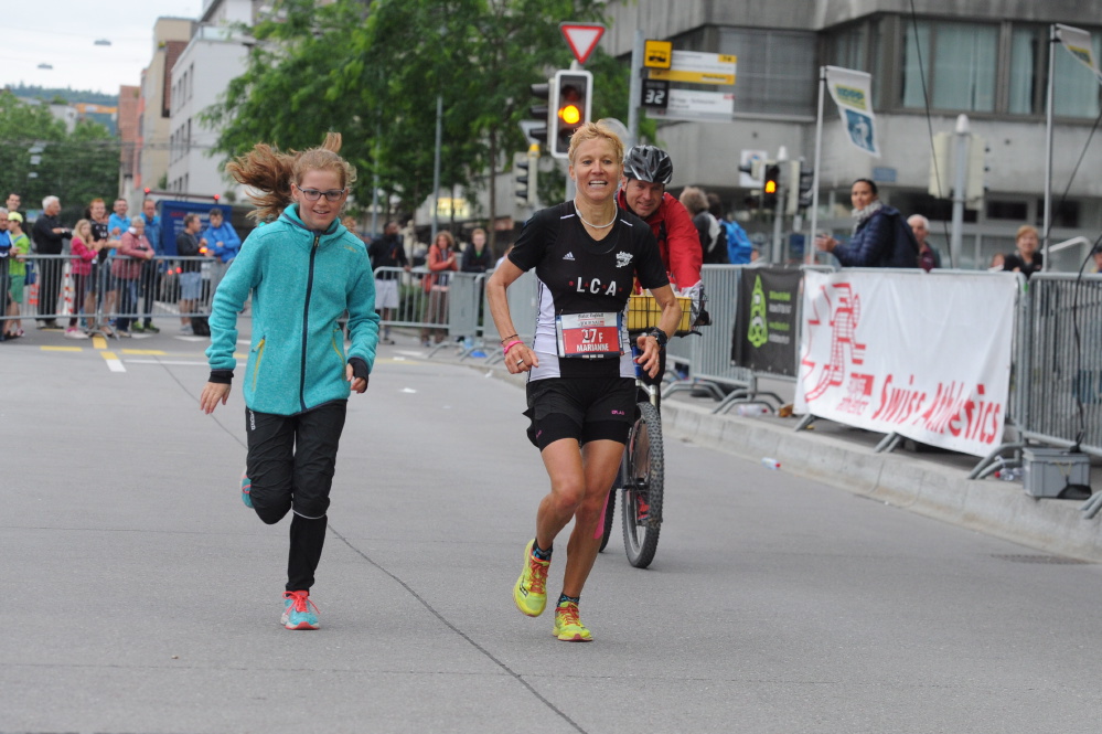Kurz vor Biberen entdecket dann mein Velofahrer die ersten hellrosa farbenen Wölkchen am Himmel, langsam fingen die Vögel an zu pfeifen und nach Arch durchlief ich noch eine Mückenplage. Jetzt wars klar, es kann kommen was mag, das packen wir noch.... Plötzlich wars nur noch ein Halbmarathon, dann noch der GP, dann noch ein Zehner und schlussendlich noch der Frauenlauf. Da fand ich wieder Worte und schickte zum eigenen Entsetzen, meinen Velofahrer kurz nach hinten, mit dem Auftrag, er solle schauen wo die dritte Frau ist. Es ging nicht lange kam er zurück mit der Antwort, die sei weit und breit nicht zu sehen. Und dann weit vorn, wie eine Fatamorgana ein schwarz weisses Trainerjäckli auf einem Velo, das kann nur Tinu mit der Kamera sein.... Das lange ersehnte Schild 99 an der Bahnlinie. Den letzten km schwebte ich leicht über dem Boden in Richtung Ziel. ....ja und dann übermannten mich die Emotionen, Glück im Quadrat, meine ganze Familie, der ganze LCA, das gelbe Shirt mit der Aufschrift 2. Frau, das Interview.... MERCI allen, allen, allen. Ja allen die anwesend waren, allen die mitdachten, allen die mitfieberten, allen die begleiteten, Pesche für den minutiösen Zeitpaln, welchen ich aber dann um 2 Minuten unterbot....und allen die ich vergessen habe...