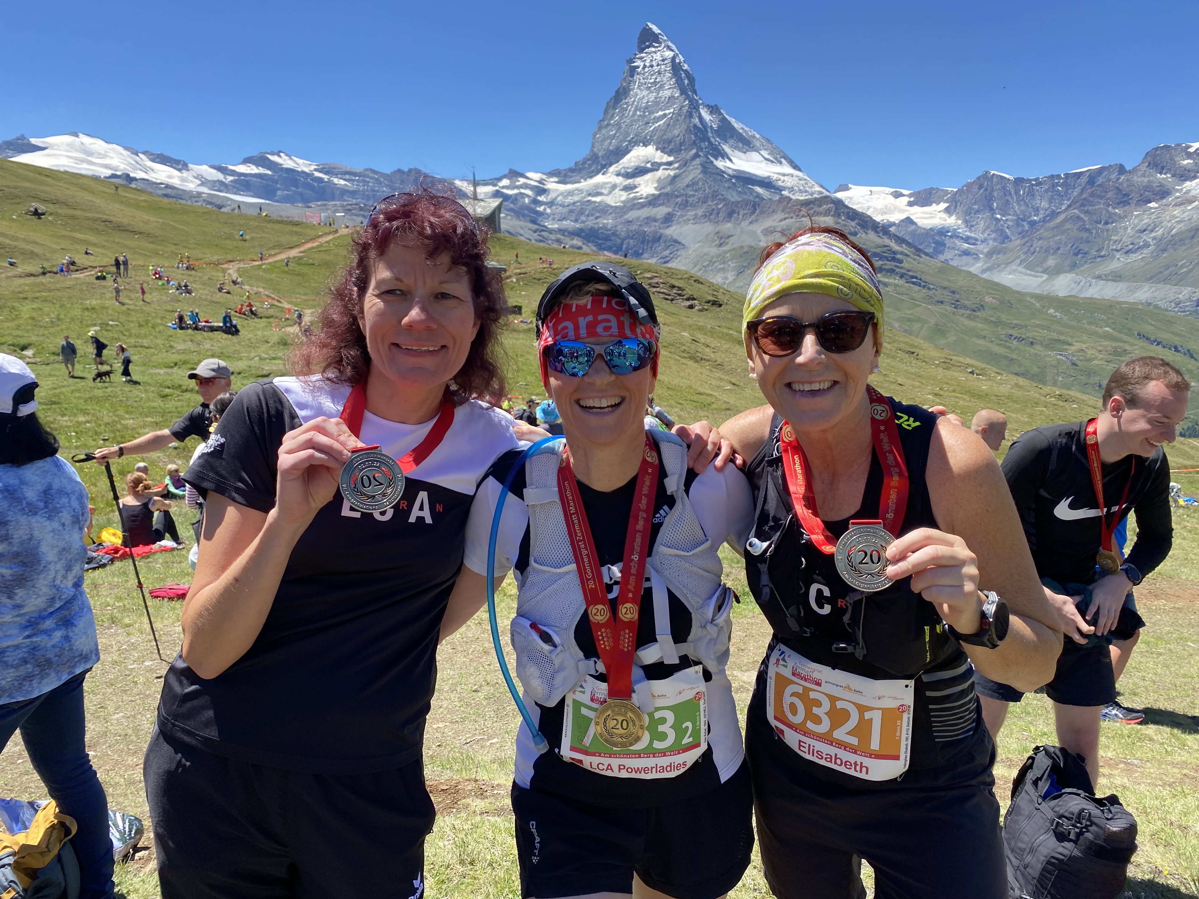 Voller Vorfreude und mit ziemlicher Nervosität meinerseits machen wir 5 Frauen uns in aller Frühe auf den Weg Richtung Zermatt. Eli und Marianne sind bereit für den Halbmarathon, Rahel und ich bestreiten gemeinsam den Marathon als Staffel. Mit dabei als grossartige Supporterin ist Barbara. Nach dem eher kalten und verregneten Freitag, sind wir alle sehr glücklich, denn heute scheint die Sonne und der Himmel ist tiefblau.