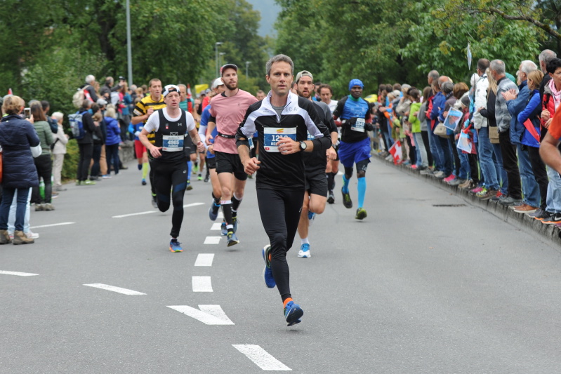 Mit etlichen Laufkilometern in den Beinen, wie sie mir Pesche in seinem umsichtigen Trainingsplan empfohlen hatte, stehe ich am Start für meinen zweiten Jungfrau Marathon. Interlaken präsentiert sich kühl, die Berge verhangen und Regen ist angesagt. Doch