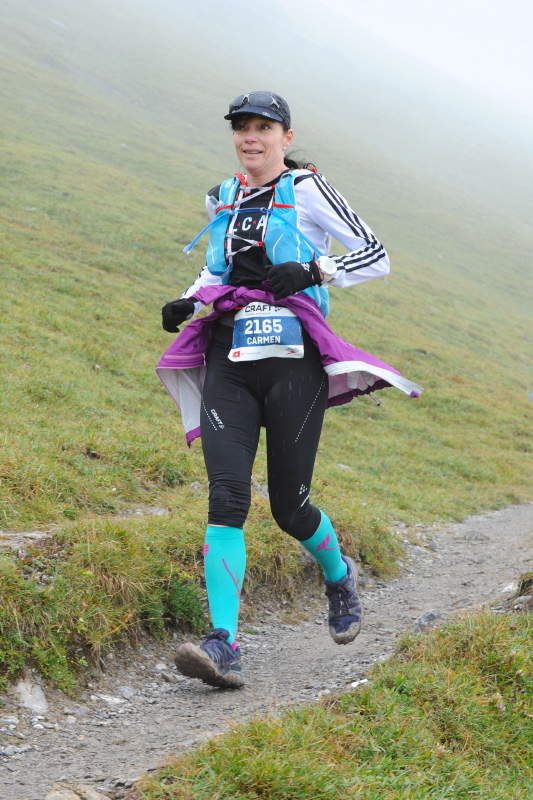 Recht steil ist es auch danach, für mich grad noch knapp im Laufschritt. Ein Blick auf die Uhr, noch etwa 1 ½ Stunden bis zur letztjährigen Zeit, nein das wird nicht zu schaffen sein. Twixi rückt näher, da steht Ursina. Ich lasse mich von ihrer Begeisterung weitertreiben, auch ihr ein riesiges Merci! Bei der Wegteilung komme ich wie letztes Jahr links herum. Glitschig ist es, jetzt nur nicht irgendwo neben den Weg purzeln. Im langen Hang vor der Moräne geht’s in Einerkolonne hoch. Zu schade, ich möchte noch etwas schneller … Ach was, sei zufrieden, dass es bis hierhin so gut ging! Auf der Moräne gibt es wieder etwas Luft, ein letzter Powerschub hinauf. Dann hinunter auf dem nassen Weg, vorsichtig, ich will nicht noch im Dreck landen. Ein fulminanter Schlussspurt sieht anders aus - aber dann ist das Ziel erreicht – ich bin total glücklich, auch mit den zusätzlichen 2 ½ Minuten Laufzeit!