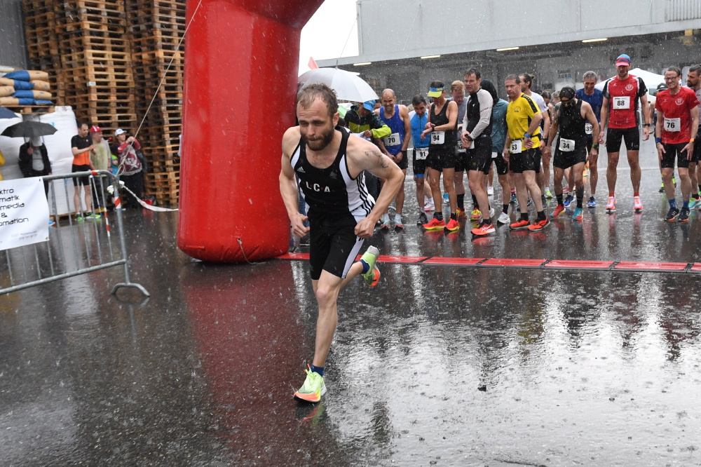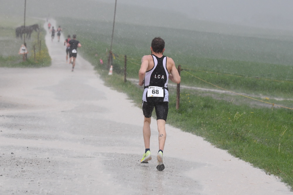 Ich lief los und bereits nach ein paar Hundert Metern fing es an zu Hageln. Der Wind wehte die Hagelkörnen mit noch mehr Kraft als Schwerkraft auf Kopf und Körper. Es schmerzte, doch ganz nach dem Motto: «Chopf abe und düre!». Auf der ersten Runde stürzte vor mir ein Läufer im nassen Gras, Läufer*innen, die ich überholte sprachen bereits von Aufgeben. Es waren definitiv die härtesten Bedingungen, die ich je in einem Lauf erlebte. Nach der ersten Runde lief ich in Richtung Zielbogen, der aufgrund des starken Windes fast am Boden lag. Weiter geht’s, nächste Runde! Es hagelte wieder stark, doch ich gewöhnte mich an den Schmerz. Tinu war stand auch hier immer wieder mit seiner Kamera bereit, um mich anzufeuern. Dann nach dem Hagel starker Regen. Ich hatte das Gefühl nur noch in Pfützen zu laufen. Kurz vor dem Ziel, beim Bahnhof, war der Bach überlaufen. Dicke Äste und 15cm hoher Schlamm mit Wasser machten das Weiterkommen schwieriger. Es schien alles aus dem Ruder zu laufen. Ich war dennoch motiviert die letzte Runde in Angriff zu nehmen. Doch dann nach Passieren des Zielbogens, wurde ich abgewunken. Jemand teilte mir mit, dass nur zwei Runden gelaufen werden, da das Rennen unter diesen Bedingungen nicht weitergeführt werden kann. So nahm der abenteuerliche Lauf ein Ende und ich musste auf Befehl von Tinu eine warme Dusche nehmen, um einer Erkältung vorzubeugen. Alles in Allem ein erlebnisreicher Tag, mit vielen Höhepunkten und Herausforderungen. Ich freue mich bereits auf den nächsten Gürbetaler Duathlon!