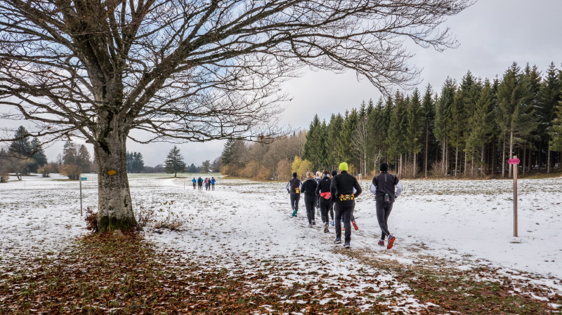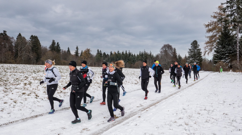 Auf der Fahrt zum Treffpunkt hält uns ein Verkehrskadette an. Der Grund ist, dass in unmittelbarer Nähe die Judo-Schweizermeisterschaften stattfinden. Angesichts der Wetterverhältnisse vielleicht keine schlechte Alternative. Einmal am Laufen ist es dann aber doch genügend warm. Reto gibt mir nach einer Weile seinen Pullover in den Rucksack. Ich schiebe zuweilen die Ärmel zurück. Und mit Trailschuhen, die uns im Vorfeld aufgrund der Bodenverhältnisse empfohlen wurden, geht das Laufen auf dem schweren Boden – im Fussball würde man wohl von einem tiefen Terrain sprechen – erstaunlich gut. Läufer mit klassischen Runningschuhen rutschen jedoch zuweilen.