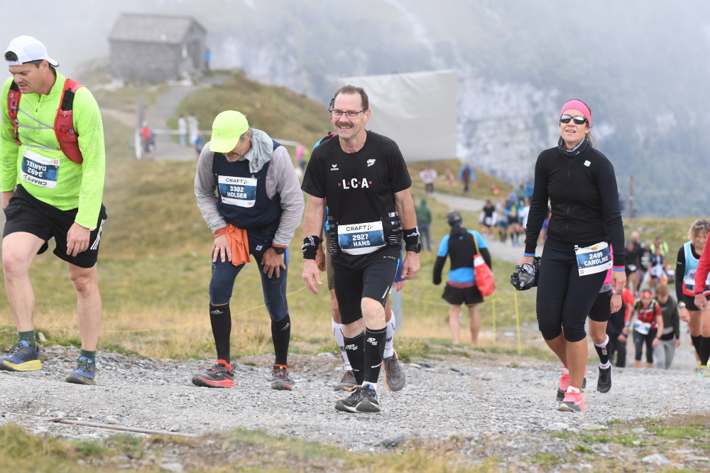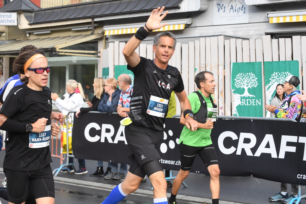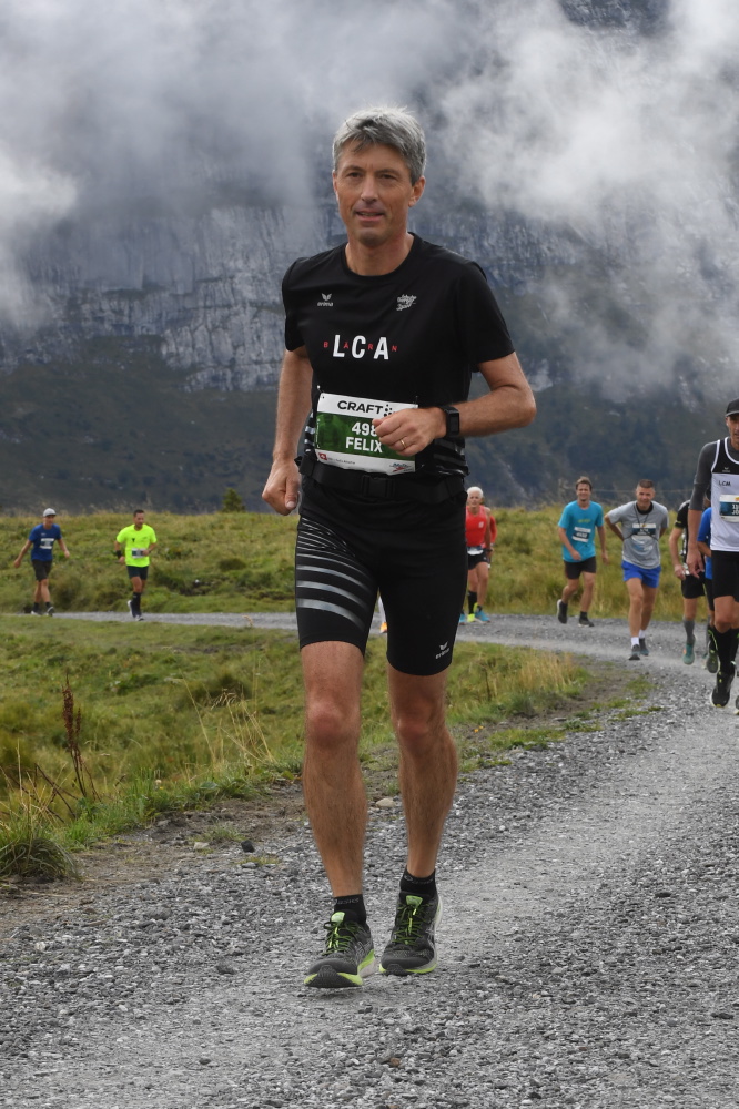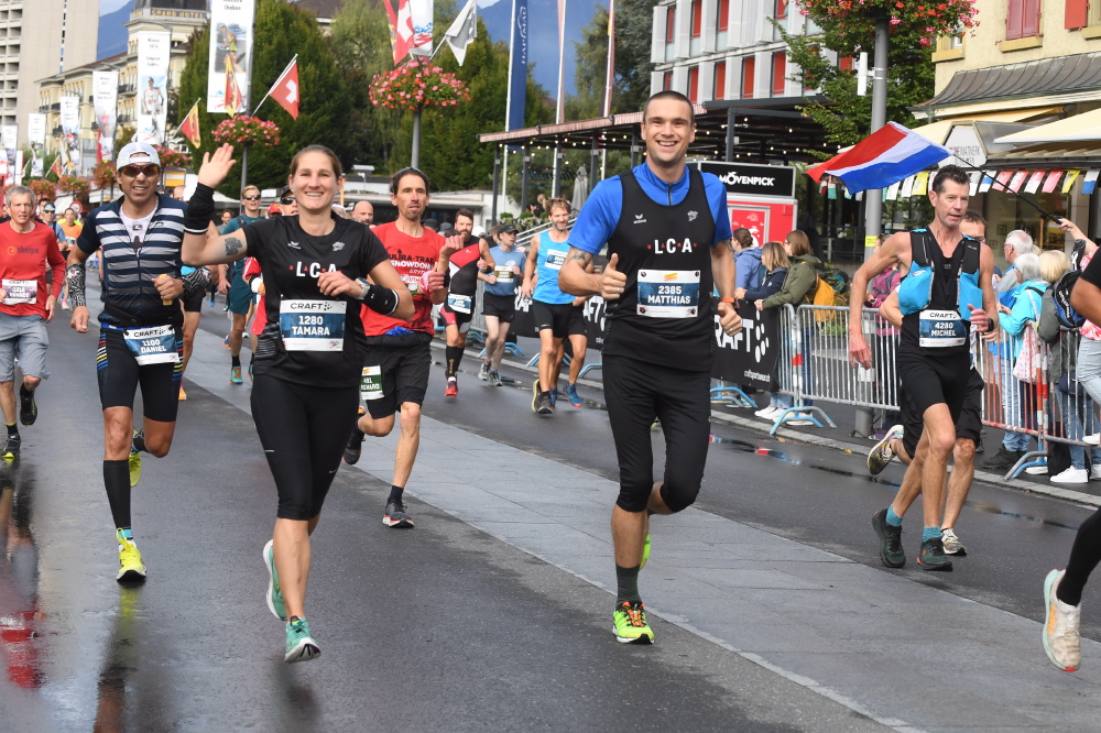 Interlaken, 07:05 Uhr, leichter Regen, der Tag scheint erst langsam zu erwachen, doch in der Casinohalle herrscht reges Treiben. Es ist so weit, der 29. Jungfrau-Marathon steht vor der Tür. Zahlreiche Läuferinnen und Läufern holen ihre Startnummern ab, treffen letzte Vorbereitungen, überall wird geplaudert, es herrscht eine positive, freudige und leicht nervöse Stimmung. Bereits hier wird deutlich, es sind zahlreiche Vertreter/innen des LCA Bärn anwesend, um die 42.195km bis hinauf zum Eigergletscher unter die Füsse zu nehmen. Insgesamt starten 11 LCA’ler, wobei wir mit Priska und Marianne sogar zwei Läuferinnen am Start haben, die in der Elite-Kategorie um die Podestplätze mitmischen. Während die beiden um 08:30 Uhr aus den vordersten Reihen das Rennen in Angriff nehmen, verteilen sich Daniel R., Daniel B., Mätthu, Roger, Felix, die Familie Buser und ich individuell über die verschiedenen Startblöcke. Pünktlich um 08:30 Uhr fällt der Startschuss, 4000 Läuferinnen und Läufer laufen gemeinsam los, um diese wunderbare Trailstrecke zu bewältigen. Unterwegs werden wir immer wieder von zahlreichen Zuschauenden angefeuert, sogar aus dem vorbeifahrenden Zug wird gejubelt und beim Eintreffen in Lauterbrunnen erwartet uns ohrenbetäubender Support. Ab Kilometer 26 geht es dann steil bergauf in Richtung Wengen. Während ich im Stechschritt die Serpentinen hoch eile, denke ich an die Eliten, die wahrscheinlich schon bald aus Wengen raus sind. Der erste steile Anstieg ist dann bald geschafft, in Wengen wartet wieder ein phänomenales Publikum, hier gilt es für den weiteren Weg, Energie aus den vielen Zurufen zu tanken. In den vielen Zuschauenden entdecke ich Lars (Okle), der uns LCA’ler und natürlich vor allem seine Eltern, in Eigenregie anfeuert.