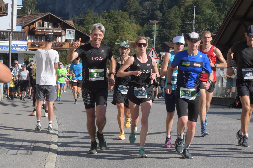 Leicht nervös kam ich in Interlaken an. Die Bedingungen waren gut, wenn auch die Wetterprognose heisse Temperaturen in Aussicht stellte. Die Beine waren regeneriert und die Motivation war nach den vielen Trainingsstunden hoch. In Mitten der zahlreichen Läuferinnen und Läufer kann ich den Start kaum abwarten und bin gespannt auf den Verlauf der nächsten Stunden. Die ersten Kilometer kann ich mit einem super Gefühl absolvieren und die Zurufe der Zuschauer haben mir den Weg zu einem unvergesslichen Lauftag geebnet.
