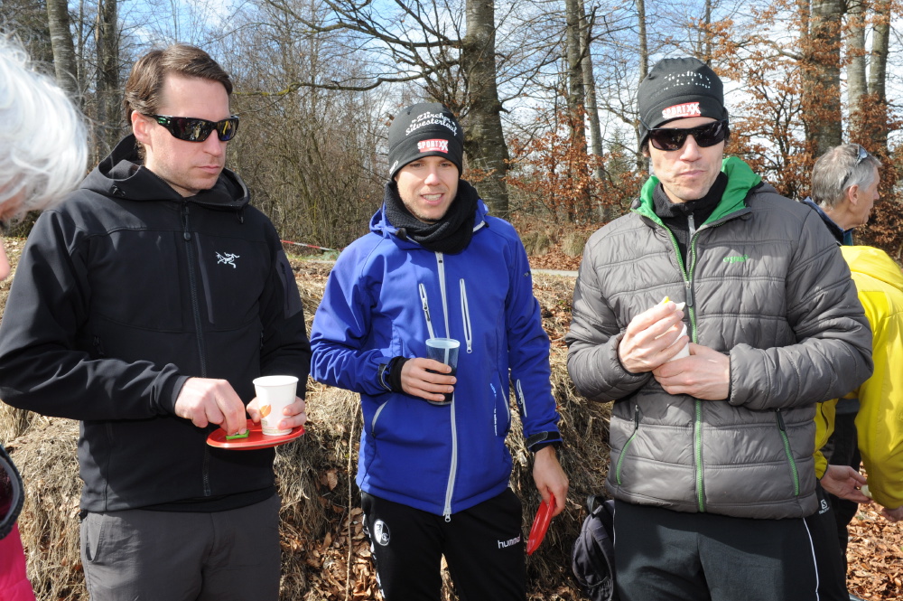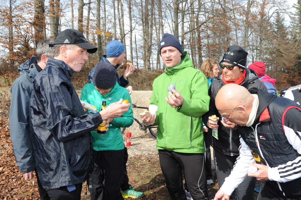 Zurück von den Trainingsrunden gibt es für die wohl über 50 Teilnehmer ein Picknick. In der Mitte liegen Ostereier, auch welche von Barbaras eigenen Hühnern. Sie zählt mir ihre Tiere auf, darunter eine Schildkröte, die noch immer unter Laub Winterschlaf hält, so lange wie nie zuvor. Auch Bier ist vorhanden. Ich nehme eines und möchte mit Fritz anstossen, doch nun, da es tatsächlich Bier gibt, von dem Fritz so geschwärmt hat, bleibt er verschwunden. Zu Bier passt Schokoladekuchen definitiv nicht. Aber egal. Und es ist ein richtiger Schokoladenkuchen, nicht einfach ein Kuchen mit Schokolade. Jemand sagt: Isst man davon, hört man nicht mehr auf, bis er ganz weg ist. So ein Kuchen ist das. Kathrin, die klarstellt, den Kuchen nicht gebacken zu haben, verrät, wie das Erfolgsrezept dafür aussieht: Zuerst grosse Stücke Butter, dann sehr viel Schokolade und ganz wenig Mehl. Vielleicht kann man noch etwas Nüsse oder Mandeln beifügen. Fritz sehe ich später übrigens wieder. Wir stossen an und das Gespräch geht von Braukunst über Ovomaltine zu Politikern.
