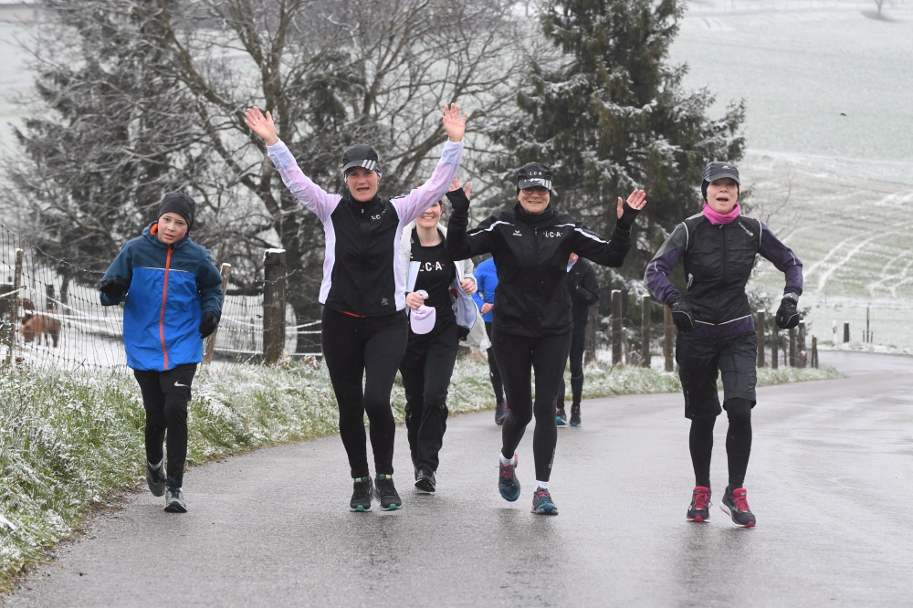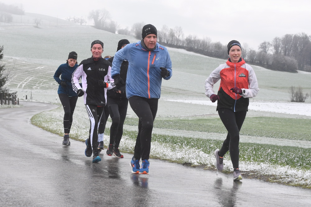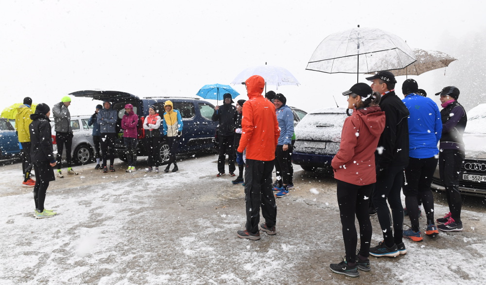 einer Winter-Rückkehr: schönste Flocken fielen vom Berner Himmel. Nichtsdestotrotz fanden sich nach einer ersten Stärkung im warmen Daheim einige hartgesottene und/oder trainingsfleissige LCA-Läuferinnen und Läufer auf dem Belpberg zum alljährlichen Auftakt des Ostertrainings ein. Einige verharrten bis kurz vor dem Start im wohlig geheizten Auto, andere ganz Tollkühne konnten auf dem Parkplatz bereits die erste Velo-Bergankunft feiern.