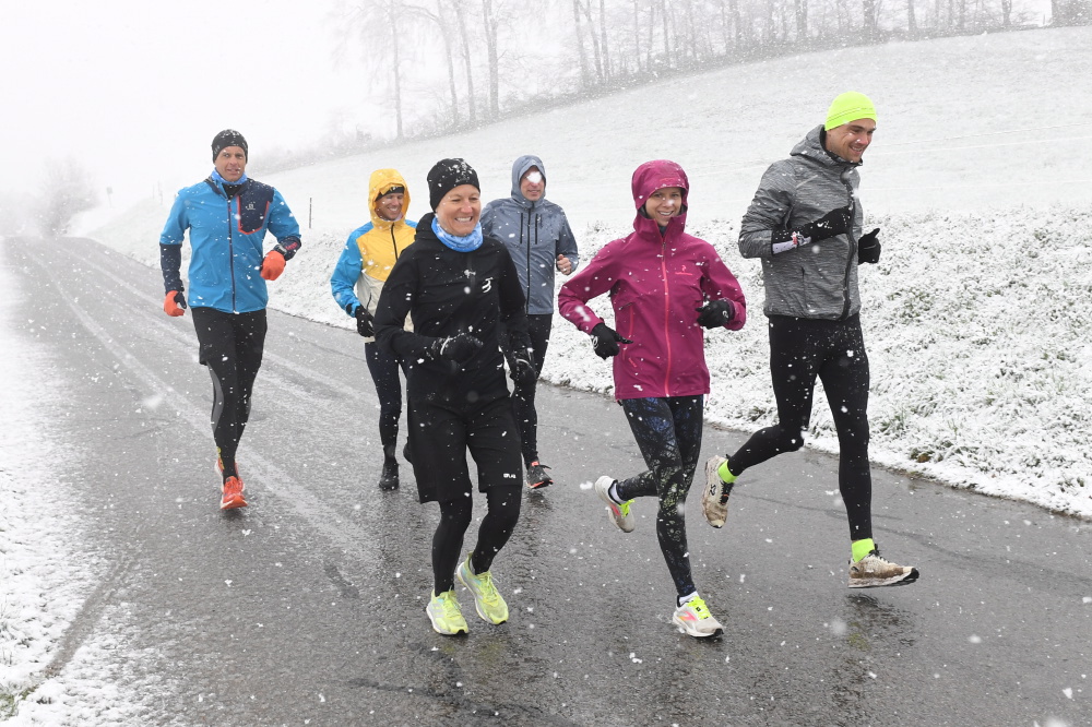 Los ging es auf die Aufwärmrunde mit Schnee von oben und Matsch von unten. Bei der Chäsi angekommen, wurde das Tempo für eine zügige Runde verschärft. Mittlerweile hat sich die Witterung gebessert und einige wenige vermuteten sogar die Sonne durch die Wolkendecke zu erkennen. Nach mehreren Anstiegen und Bergab-Passagen auf unterschiedlichstem Terrain war bereits wieder die Chäsi erreicht, wo der Rest der Gruppe in Empfang genommen wurde und das Auslaufen starten konnte.