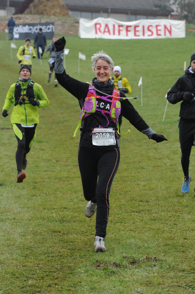 Diesmal waren die Wetteraussicht eher mässig, um die 0 Grad, Graupel, Nebel, ein bisschen Schnee (letztes Jahr 20 Grad und Sonnenschein), aber als wir dann um 9 Uhr losgelaufen sind, wurde es mir schnell wärmer. Zu dieser Zeit waren Barbara, Tinu und Luc schon eine Stunde unterwegs. Es ging am Sportplatz hoch und danach kam eine schöne Abwechslung von Wald und Wiesen. Glücklicherweise war alles gut ausgeschildert, so dass man auch im Nebel weiter wusste.