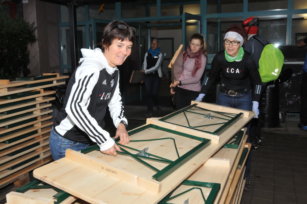 Der letzte Zieleinlauf dauerte noch eine Weile, bevor all die LCA - Heinzelmännchen mit den Abbauarbeiten im Stadion beginnen durften. Diese gaben nun ebenso Gas um möglichst schnell alles ans Trockene zu bringen. Nach der Verlosung mit vielen glücklichen Gewinnern zogen die Besucher heimwärts. Nun galt es rasch die Hallen und Garderoben in den Originalzustand zurück zu versetzen. Tische, Bänke wegzuräumen, allerlei sortieren und zu putzen. Dank dem Grosseinsatz vieler unermüdlicher LCA- Helfer/innen war alles vor dem Eindunkeln erledigt.