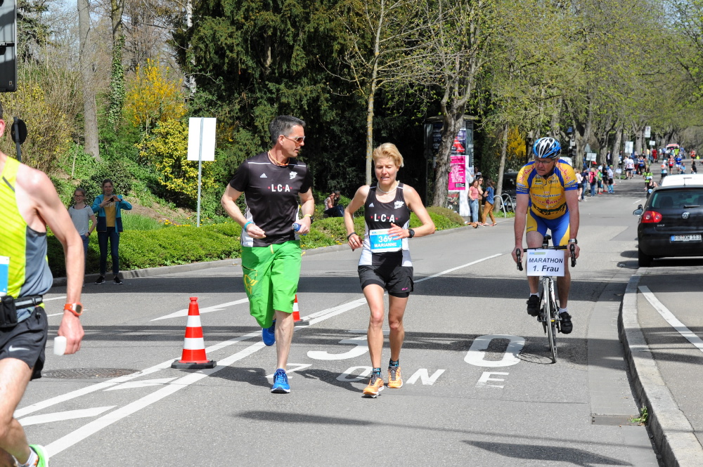 Der Rundkurs durch die Stadt von Freiburg musste für den Marathon über zwei Runden gelaufen werden und die Altstadt mit dem Kopfsteinpflaster und den Tramschienen hatte ihre Tücken. Da der Start erst um elf Uhr erfolgte, drückte die ungewohnte Wärme stark und einige bekundeten Mühe. Nicht so Marianne die ihr Tempo halten konnte und überglücklich ins Ziel lief.
