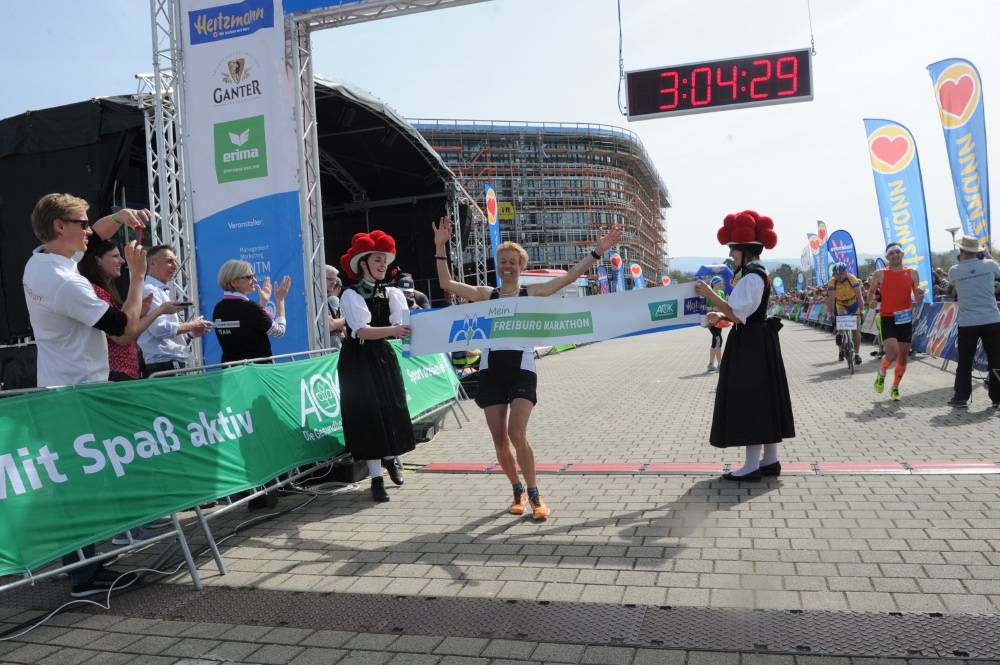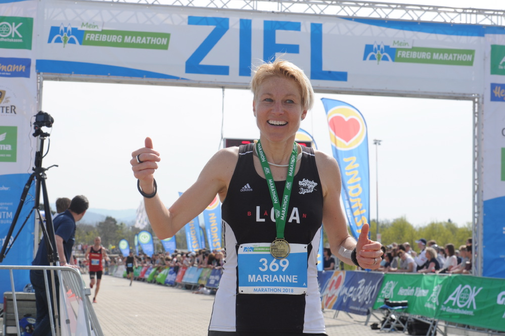 Marianne gewinnt in einer Zeit von 3:04’21“ den Freiburg Marathon! Von Anfang an der Spitze laufend konnte sie sich bei warmen, frühlingshaften Bedingungen durchsetzen und gewann ihren ersten grossen Städtemarathon.