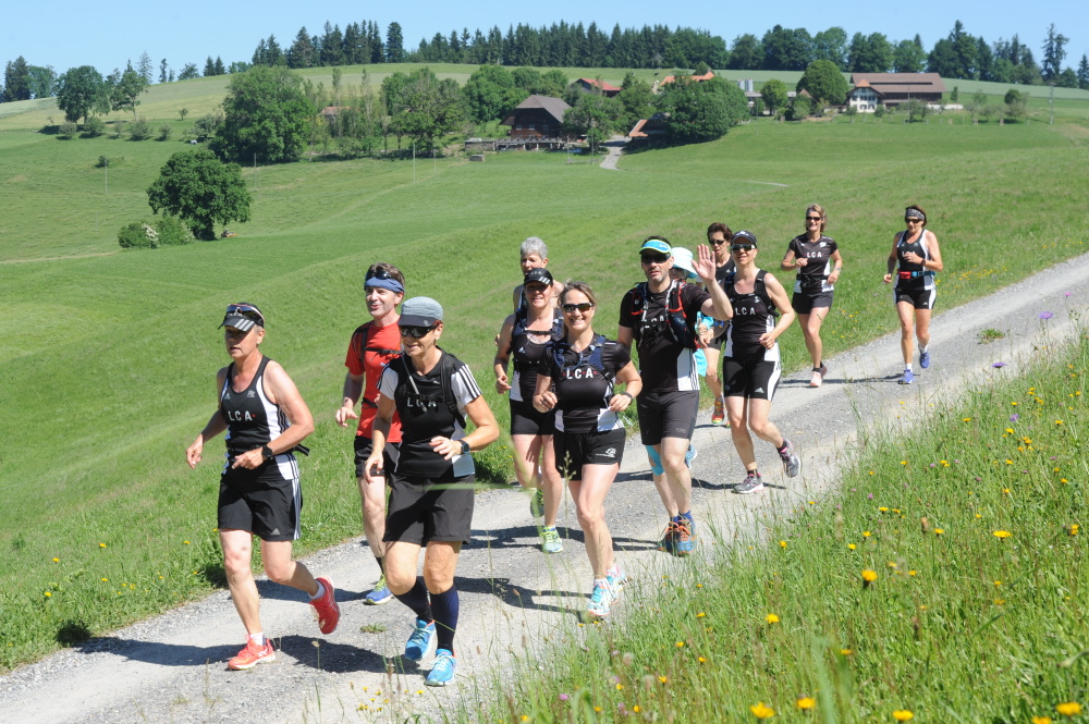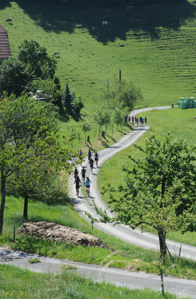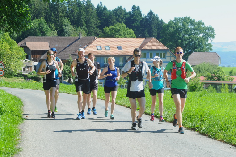 Tags darauf stehen wir früh auf, essen ein (wiederum kohlenhydratreiches) Z'morge und fahren dann rechtzeitig los, damit wir nicht zu spät beim Treffpunkt Schulhaus Zimmerwald ankommen. Dort begrüssen wir uns gegenseitig und teilen uns in Gruppen auf (Marianne teilt sich vernünftigerweise in unsere Gruppe ein, da sie eine Woche zuvor am Freitag die 100km Strecke anlässlich der Bieler Lauftage grandios absolviert hat (nochmals Bravo!).
