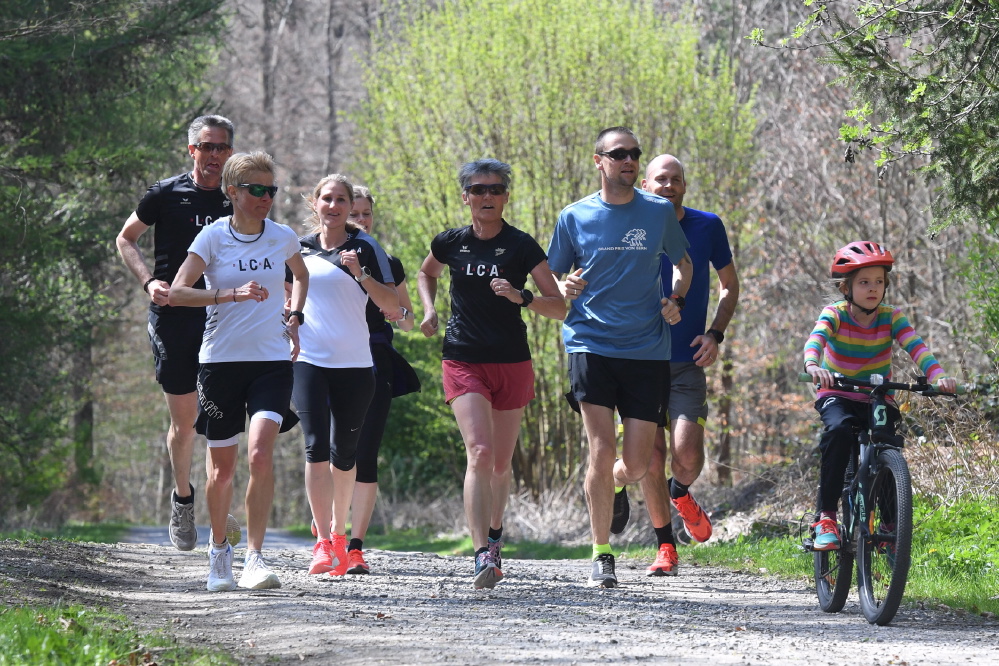 Wie gwohnt cha d Americaine mit em Bäupbärg Training teilnähmermässig nid mithaute. Aber mir si doch es stattlechs Trüppli gsi wos sech da am Samschtig Namittag ir Bodeweid troffe het. Dr einzig Spieuverderber isch Bise, wo üs am Afang echli lat la schlottere. D Marianne git no es paar Awisige. Aber wo isch scho nume das Bänkli wo mer üs nach em iloufe sötte träffe? Was da nach zwöi Jahr aues vergässe geit. Aber es klappet. Z Bänkli isch no da aus hättis di zwöi Jahr nume uf üs gwartet. D Marianne verteilt farbigi Zuckereier, damit mir so drüer Gruppe chöi biude. Und los geits ei Rundi immer rächts die anderi immer links ume. D Fotos wärde diesmau vor Elis (Familie Häcki Nachwuchs) gmacht, dr Tinu het ire Kamera überlah und wärweis viellicht isch das dr Startschuss für die zuekünftegi brueflechi Karriere. Am Schluss wird d Siegertruppe frenetisch gfiret.