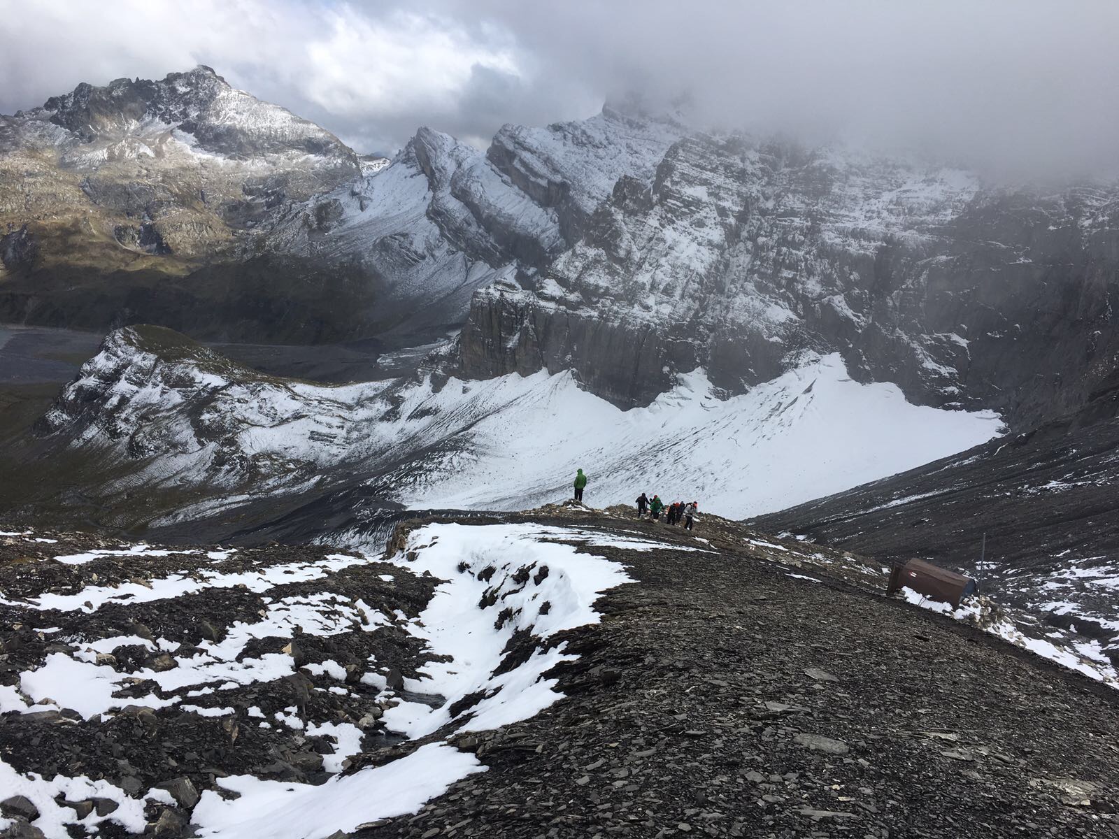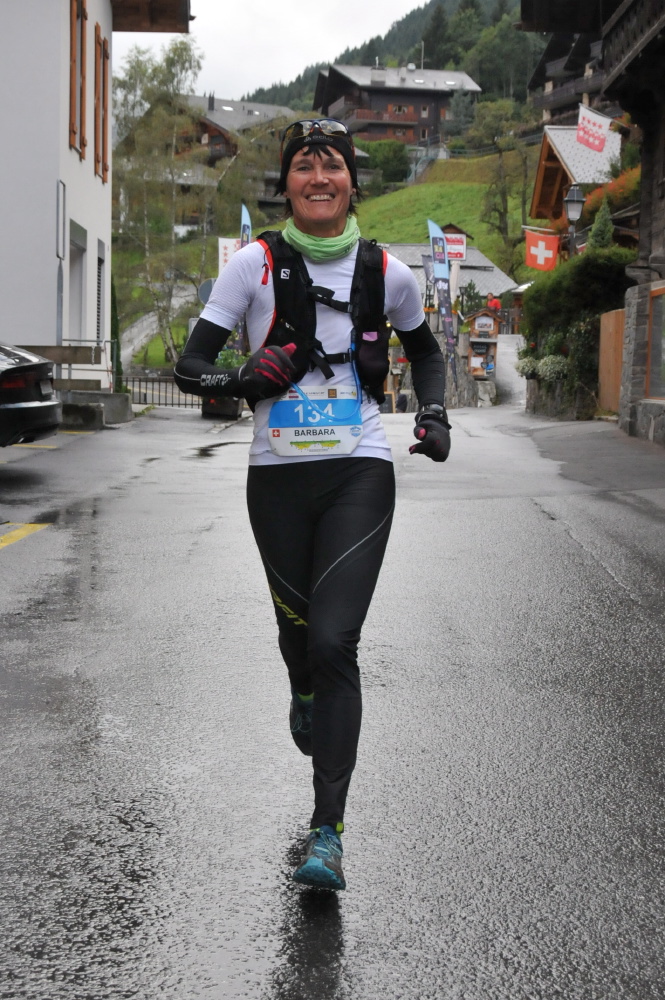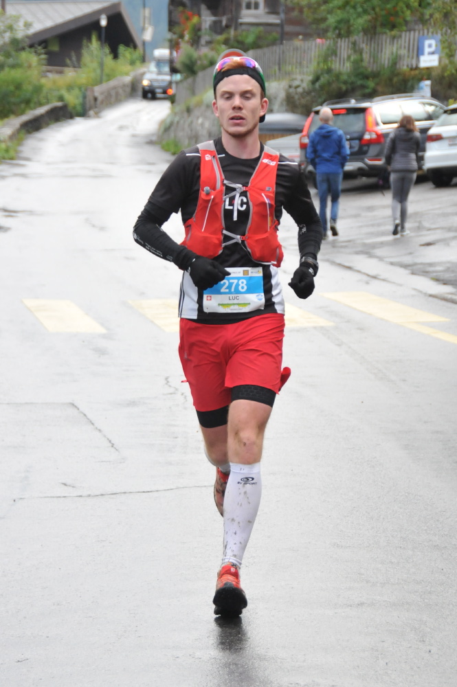 Kurz vor Sechs holte uns der Wecker aus dem Schlaf, pünktlich um die Erststartenden vom Fenster aus anzufeuern. Mit Lampen und Gepäck ausgerüstet, in zügigem Schritt vorbeilaufend, war das Spektakel schnell vorbei. Es war nun hell und bald galt es auch für uns dieses grosse Vorhaben anzupacken. Kurz vor Neun stellten wir uns ins Startfeld mitten im Dorfkern, voller Erwartungen auf dieses Abenteuer. Sachten Schrittes geht es nach dem Startschuss im Läuferfeld los und bald folgt die erste Steigung hoch zur ersten Anhöhe. Ein schönes Bild wie sich die Läufer, gleich einer Schlange, marschierend aufwärts bewegten. Stets in zügigem Schritt und sobald es flacher wurde im Wechsel mit rennen. Eine einmalige Aussicht präsentiert sich uns auf dem Höhenweg. Doch nur flüchtig konnte der Blick in die Ferne schweifen denn auf den Singletrails war höchste Konzentration gefragt. Es folgte der erste, ruppige Abstieg nach Vérossaz. Der Anstieg nach Mex, gut Rennhälfte, war angenehm zu laufen. Zum Glück wussten wir noch nicht, was uns danach im Aufstieg zum Col de Jorat erwartete. Beinahe senkrecht stieg es an und die hintersten der Frühstarter wurden eingeholt. Der Boden nass, rutschig und spätestens ab hier schätzte man es, Trailschuhe mit rutschfesten Sohlen zu besitzen. Aufziehender Nebel und Wind machte das Ganze kalt und unfreundlich. Erholung gab es beim Abstieg zum Lac de Salanfe und mit etwas Sonnenschein wurde es gleich wieder viel angenehmer. Gut Verpflegen lohnte sich bevor es zum letzten und höchsten Punkt des Trails dem Col de Susanfe auf 2494 m hochging.