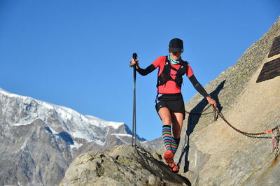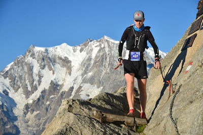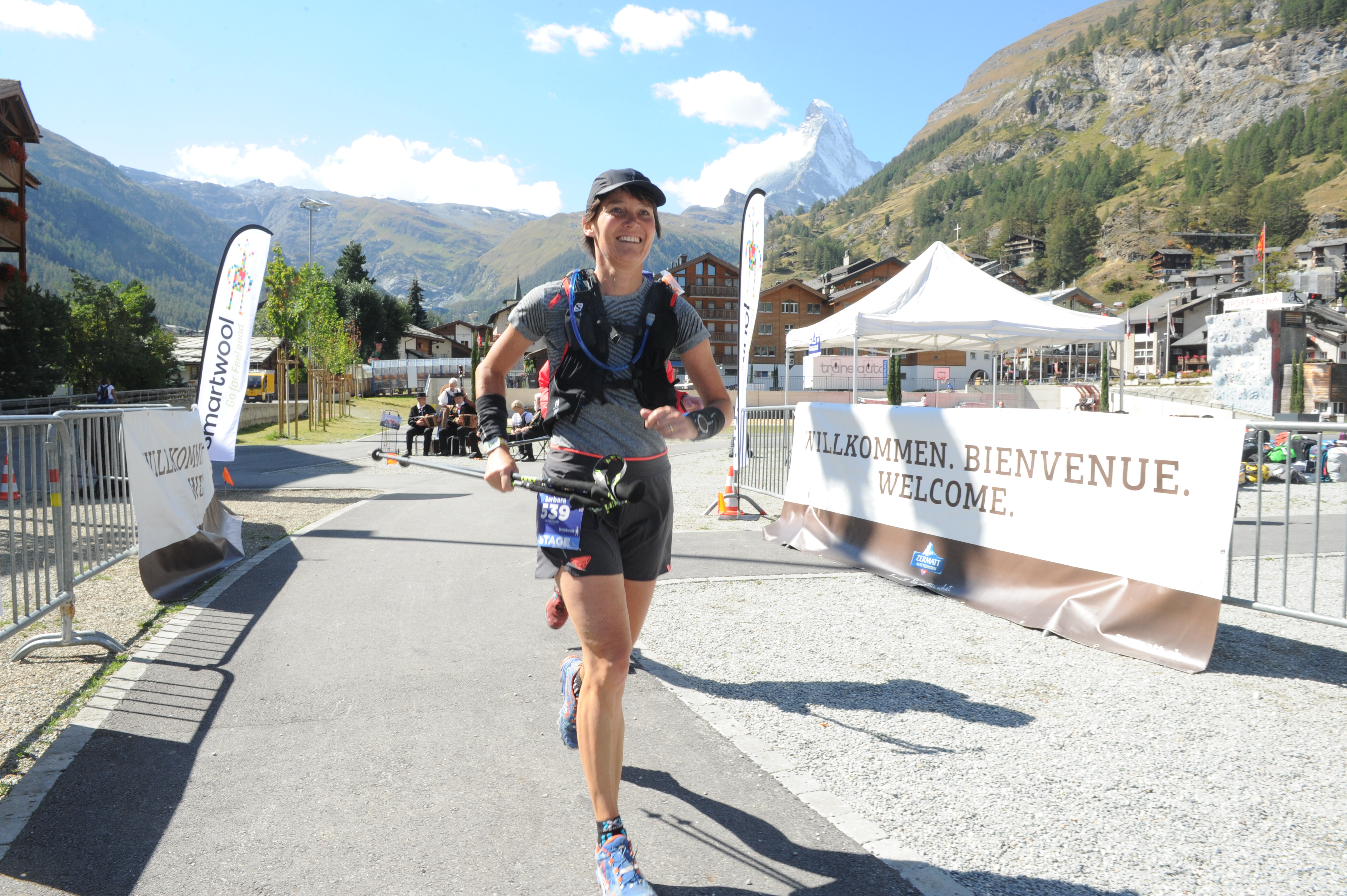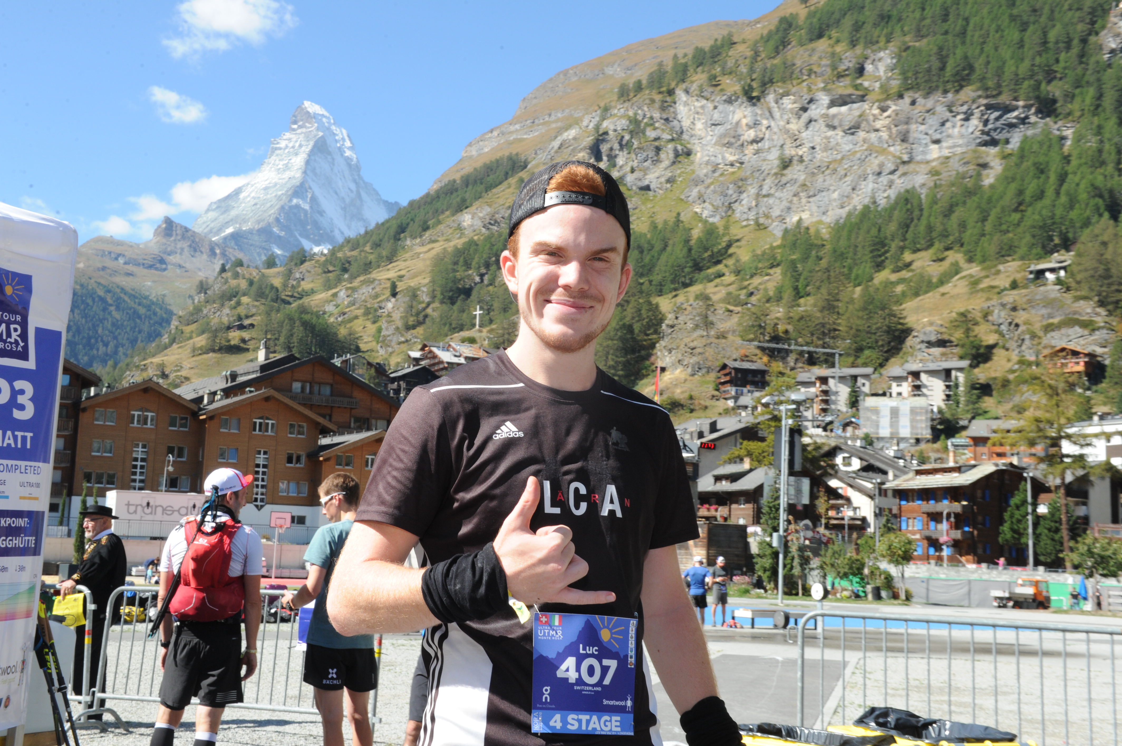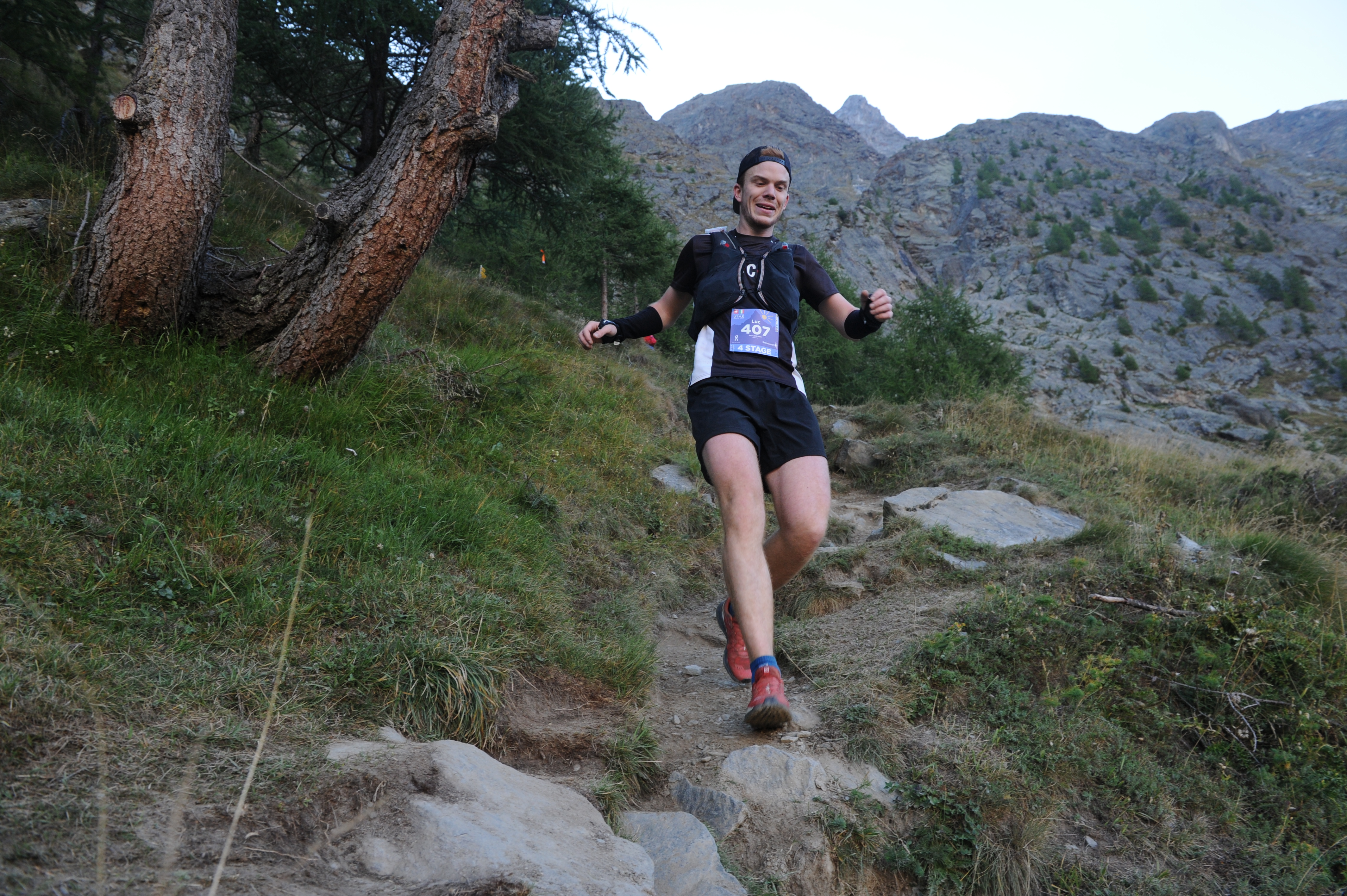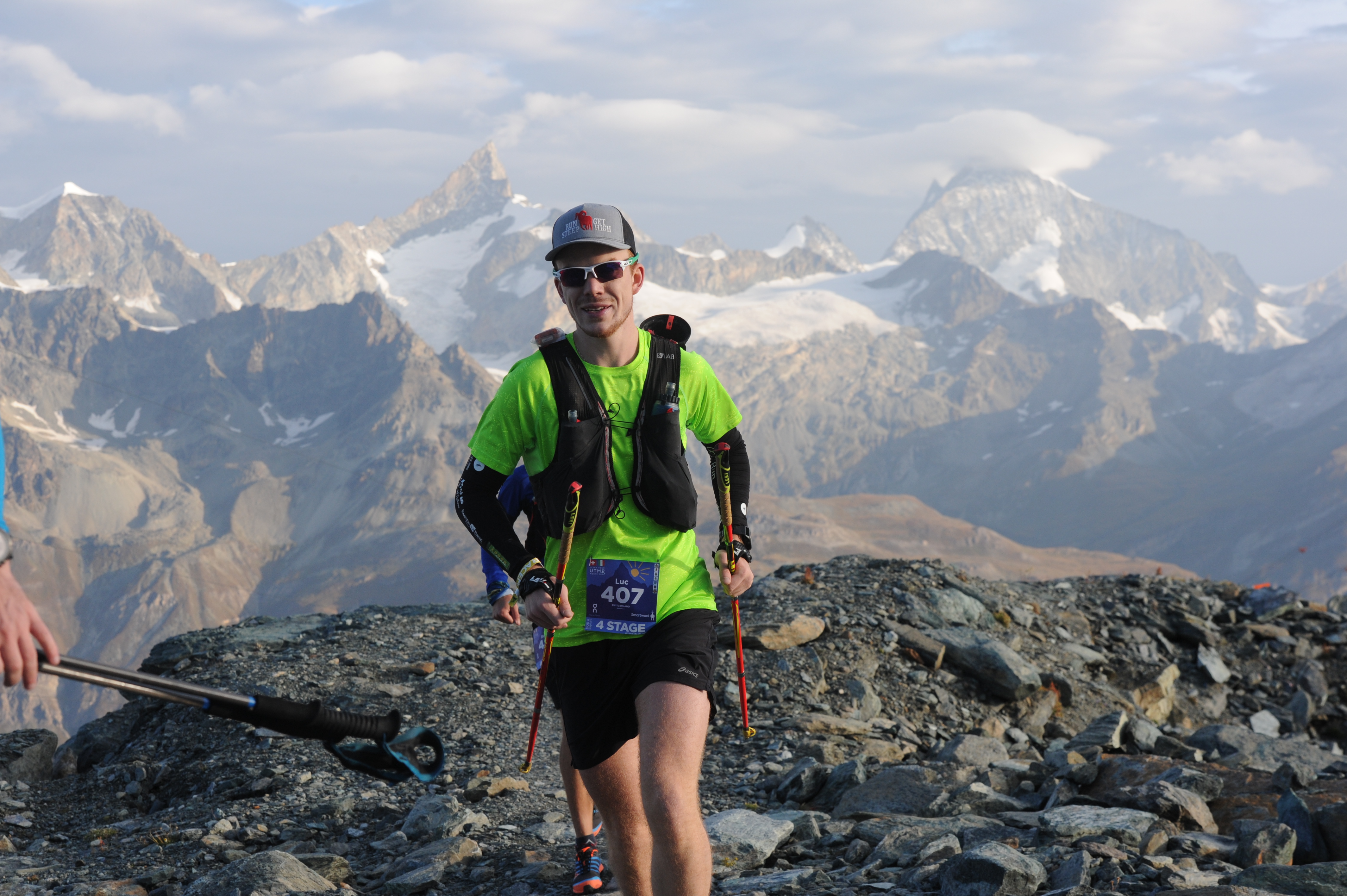 Früh um 6:00 Uhr wurden die Grächener an diesem Morgen unsanft aus ihrem Schlaf geschreckt. Der Startschuss hallte durchs Dorf und die Läufer setzten sich in Bewegung. Sterne funkelten am Himmel und es versprach ein prächtiger Tag zu werden. Ich fragte mich beim Verlassen von Grächen, in welcher Verfassung wir wohl in vier Tagen wieder hier eintreffen würden? Über schöne Singeltrails gings hinunter nach Herbriggen und weiter nach Randa. Dort erwartete uns die erste «Wand» hinauf zur Europahütte. Nach dem Kontrollposten passierten wir die imposante Karl Kuonen Hängebrücke und erreichten auf dem hoch über dem Tal verlaufenden, abwechslung- und aussichtsreichen, (Blick auf Weiss-, Zinalrothorn und Matterhorn), Europaweg Zermatt. Immer und überall tauchte unser Privatfotograf Tinu auf…es bleibt bis heute ein Geheimnis, wo er zu später Stunde am Vorabend in Grächen noch eine Übernachtungsmöglichkeit gefunden hatte! Für Luc und mich lief Tag 1 perfekt. Wir hatten den Eindruck nicht am Limit gelaufen zu sein und noch über genügend Reserven für die drei folgenden Tage zu verfügen. So genossen wir den freien Nachmittag im schönen Zermatt.
