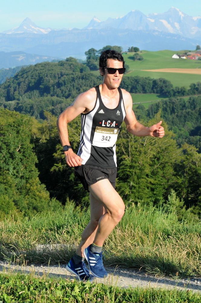 Während ich in den nächsten Tagen in der Rangliste, auf den Plätzen die niemanden interessieren, langsam aber kontinuierlich zurückfiel, verbesserte sich das Gefühl im Körper zusehends. Es fühlte sich an wie im Song «Getting better» der Beatles: «It's getting better. A little better all the time». Auch die anderen Teilnehmer des LCA, Johanna, Alain und Olivier berichteten, dass es ihnen gut lief. Auf der Bütschelegg kam ich souverän ins Ziel, am Belpberg legte ich sogar ein veritabler Schlussspurt hin und auf den Bantiger konnte nach dem steilen Startstück ein gutes Tempo beibehalten, dabei hatte ich auch genügend Luft, dem fotografierenden Tinu zuzurufen.