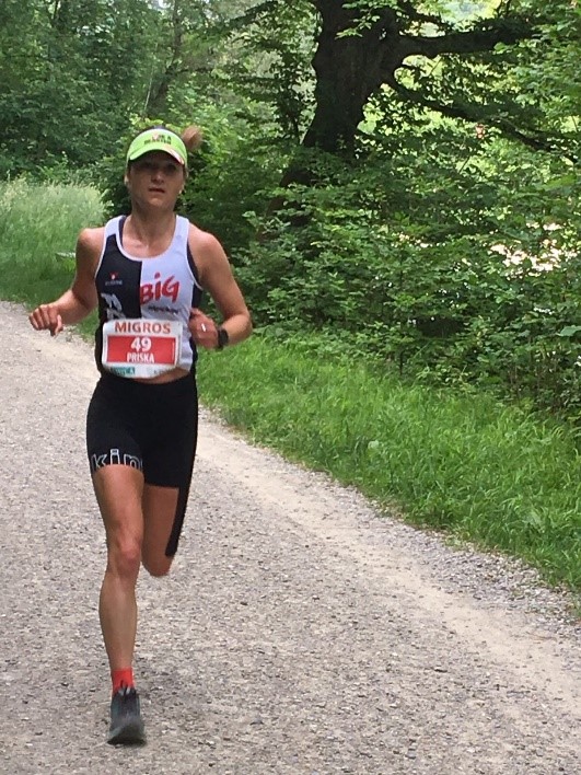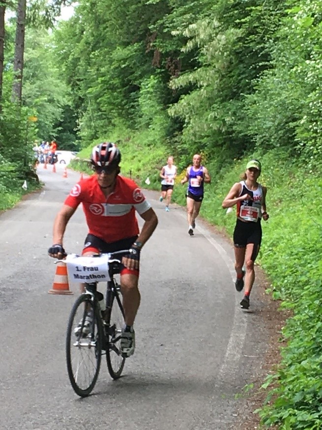 Es war ein sehr spezielles Gefühl vom Biker mit dem Schild «1. Frau Marathon» begleitet zu werden. Dies gab mir zusätzliche Motivation und Kraft. Das Wetter meinte es gut mit uns, anfangs noch hochnebelartig bewölkt wurde es auf der zweiten Runde so richtig heiss. Ich musste immer mehr Tempo rausnehmen, konnte aber trotzdem den Vorsprung auf die zweite Frau ausbauen. …und dann kam er, der Mann mit dem Hammer!! Ab km 35 kämpfte ich mit starken Seitenstechen und konnte kaum mehr atmen. Nun hiess es nochmals alle Kräfte bündeln, positiv denken, um die letzten 7 km zu schaffen. Dank meinen zwei super Supportern am Streckenrand, welche mich auf dem letzten Streckenabschnitt nochmals so richtig pushten und mit Cola versorgten, schaffte ich das Unglaubliche…. Begleitet vom tollen Publikum klatschend am Streckenrand, überquerte ich überglücklich als erste Frau die Ziellinie. Mit einer neuen persönlichen Marathonbestzeit von 3:06:14 und dem Sieg habe ich mein Ziel übertroffen.